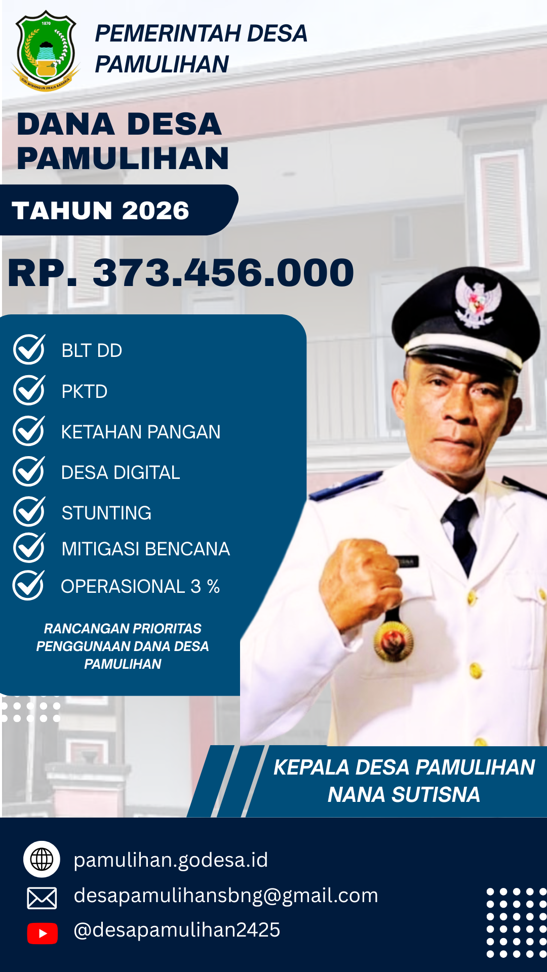 Assalamu’alaikum Warahmatullahi Wabarakatuh, Puji syukur kita panjatkan ke hadirat Allah Subhanahu Wa Ta’ala, karena atas rahmat dan karunia-Nya kita semua senantiasa diberikan kesehatan, kekuatan, serta kesempatan untuk terus berbuat yang terbaik bagi Desa Pamulihan tercinta. Dengan hadirnya Website Resmi Desa Pamulihan, kami berharap dapat memberikan kemudahan bagi seluruh masyarakat dalam memperoleh informasi mengenai pemerintahan desa, kegiatan pembangunan, pemberdayaan masyarakat, serta berbagai layanan publik yang tersedia. Website ini juga menjadi sarana transparansi, sehingga masyarakat dapat mengetahui program dan arah pembangunan desa secara terbuka. Kami menyadari bahwa perkembangan teknologi informasi menuntut desa untuk ikut berinovasi dan menyesuaikan diri, agar pelayanan publik dapat berjalan lebih efektif, cepat, dan mudah diakses oleh siapa saja, kapan saja. Oleh karena itu, website desa ini kami hadirkan sebagai jembatan komunikasi antara pemerintah desa dengan masyarakat, sekaligus sebagai media promosi potensi yang dimiliki Desa Pamulihan, baik di bidang pertanian, UMKM, budaya, maupun wisata. Akhir kata, kami mengajak seluruh warga masyarakat Desa Pamulihan untuk bersama-sama menjaga persatuan, meningkatkan partisipasi dalam pembangunan, serta mendukung terwujudnya desa yang Maju, Mandiri, dan Agamis. Semoga keberadaan website ini memberikan manfaat sebesar-besarnya bagi kita semua. Wassalamu’alaikum Warahmatullahi Wabarakatuh.